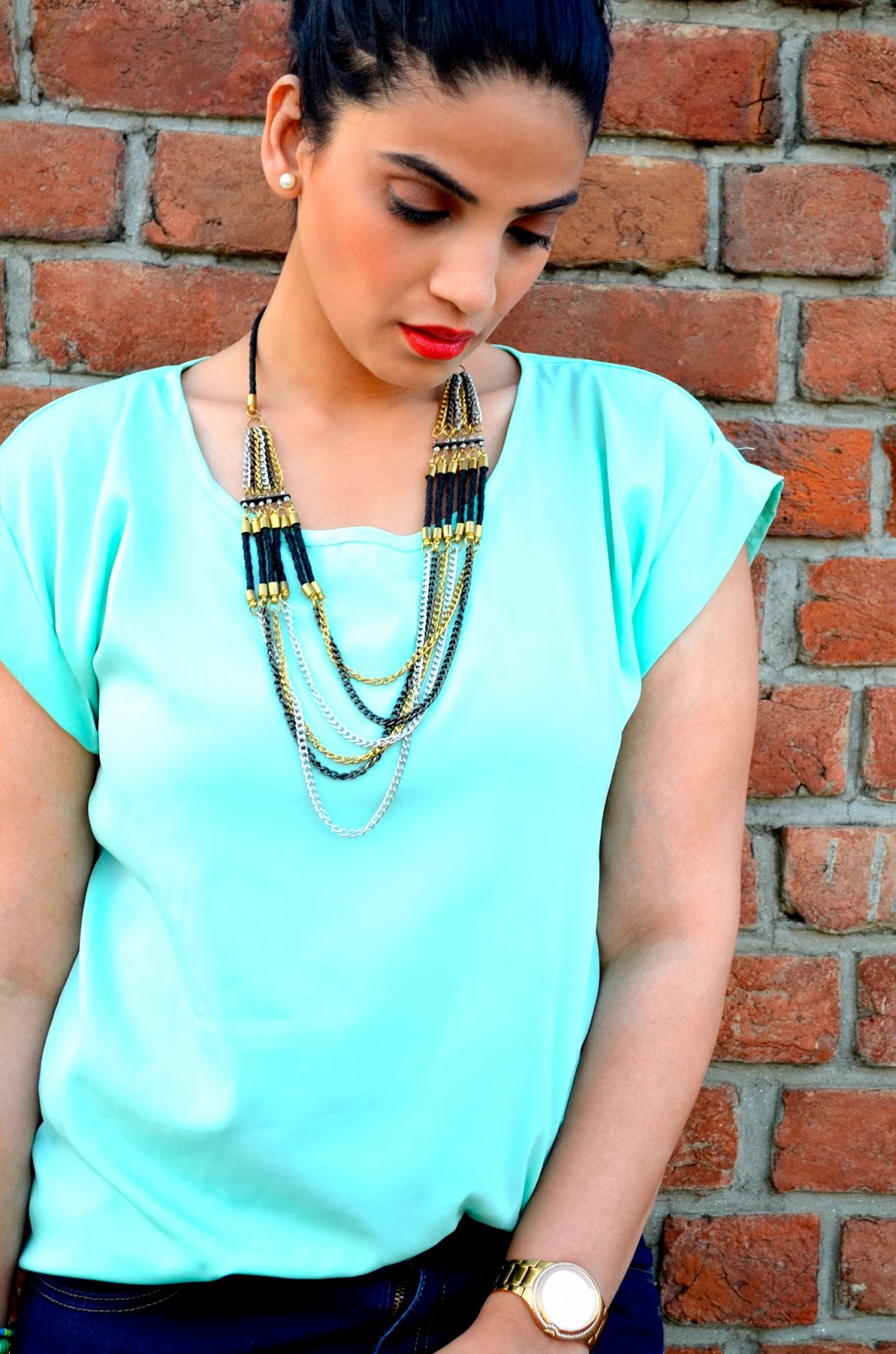 Now it's time to go bold with accessories; we have added a black - bronze chain neck piece which works really well with black base color of our bag.
